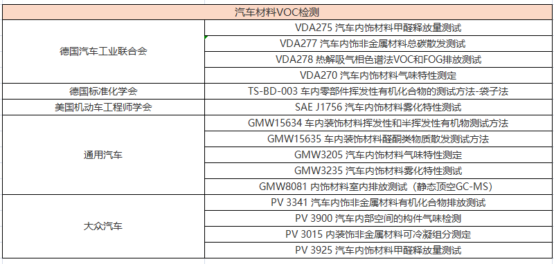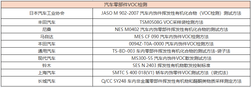 19055147252 立即咨询挥发性有机化合物(Volatile Organic Compounds,简称“VOC”)是影响车内空气质量的重要原因。VOC主要包括烷烃、烯烃、芳烃、醛类或酮类等物质,具有特殊的刺激性气味,而且部分已被列为致癌物,如氯乙烯、苯、多环芳烃等,部分VOC对臭氧层也有破坏作用,如氯氟烃和氢氯氟烃。 如今汽车已经走进了千家万户,汽车内部空气污染问题也成为消费者普遍关心的热点。各国的汽车协会和相关机构均制定了车内空气标准及要求,以便控制车内的空气质量。知名车企也分别制定各自的企业标准以管控车内空气质量。 ● VOC法规