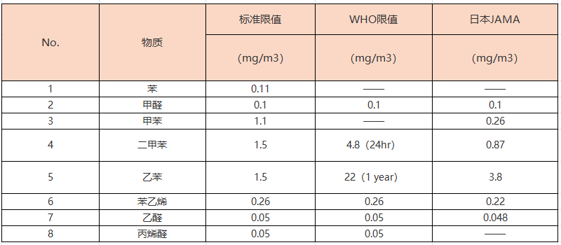 《指南》规定了车内空气中苯、甲苯、二甲苯、乙苯、苯乙烯、甲醛、乙醛、丙烯醛的浓度要求,与卫生组织(WHO)及日本汽车工业协会(JAMA)限值的对比情况见表1所示。