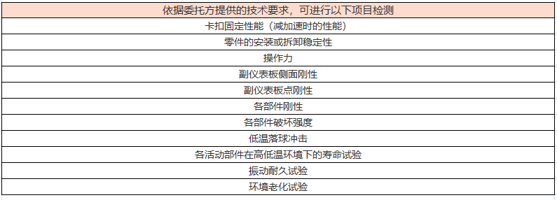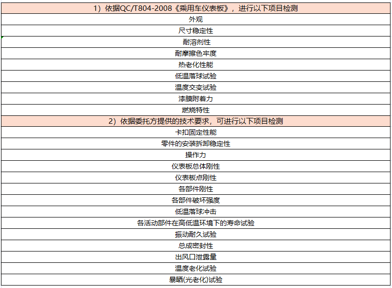 19055147252 立即咨询自汽车问世,它推动了经济繁荣,改变了人们的生活方式。同时,人们也越来越重视汽车的安全性、美观性,及舒适性,而这与汽车内饰件、外饰件的性能质量,密切相关。 检测项目汽车仪表板(包括各种附件,杂物盒、烟灰缸、出风口、横梁等):